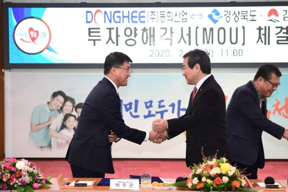 김충섭 김천시장, 동희산업 박주은 대표, 김세운 김천시의회 의장, 전우헌 경북도 경제부지사 등 20여명이 참석한 가운데 전기차 배터리케이스 생산공장 증설을 위한 투자양해각서를 체결했다.