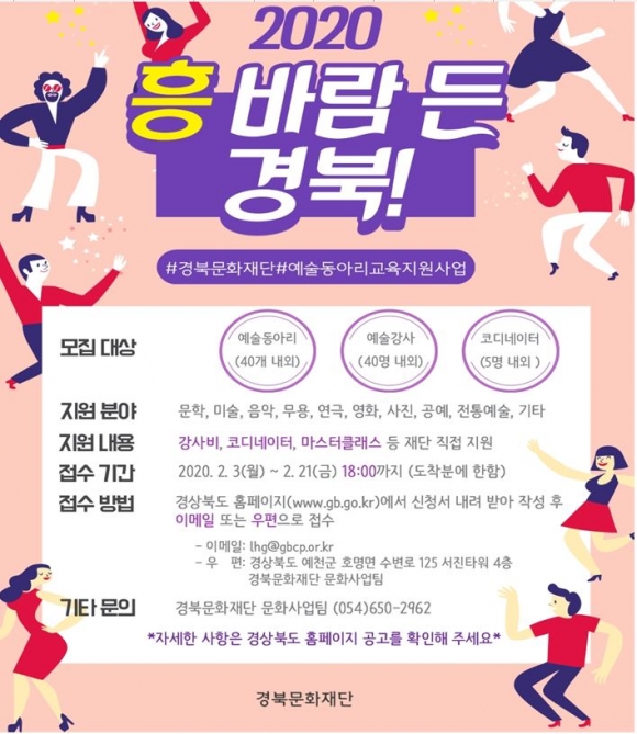 경북문화재단에서는 도민의 문화예술역량강화와 다양한 문화예술기회제공을 위해 예술동아리교육지원사업을 공모한다. 올해 경상북도에서 처음으로 시행하게 되는 예술동아리교육지원사업은 도내에서 활동하고 있는 5명 이상의 예술동아리라면 누구나 신청이 가능하며 강사지원, 코디네이터 지원을 통해 도민 문화예술교육의 기회를 확대하고 경상북도에서 자생하고 있는 예술동아리의 발굴함과 동시에 도민의 문화예술 소비와 생산의 기회를 확보할 수 있을 것으로 기대된다. 2월 3일부터 2월 21일까지 19일간 진행되는 이번 공모는 경상북도 홈페이지(http://www.gb.go.kr) 고시, 공고란을 통해 확인 가능하며 심사를 통해 도내 40개 정도의 동아리를 선정, 지원하게 될 계획이며 동아리 교육을 위한 강사와 코디네이터도 함께 선발한다. 동아리 모집 분야는 문학, 미술, 음악, 무용, 연극, 영화, 사진, 공예, 전통예술 등 다양한 예술활동 분야 전반이 해당되며, 강사인 전문예술가를 연간 50시수 파견 지원한다. 이와 더불어 지역 내 활동기반 마련 및 동아리 성장을 위한 예술 코디네이터를 선발해 운영함으로써 다양한 행사 기획 및 활성화 방안을 공유할 수 있도록 지원한다. 동아리는 경상북도에 소재지를 둔 구성원으로 구성하여야 하며 학생동아리나 단순 독서 및 감상 동아리는 신청이 불가능하다. 동아리 활동은 4월부터 10월까지 진행하여야 하며, 농번기 등 도내 23개 시군의 특성을 고려하여 활동 시기는 일부 조정이 가능하다. 또한 교육사업에 참여하는 동아리 구성원들에게 경북의 문화예술에 대한 다양성을 체험할 수 있도록 하기 위해 지역 내 고건축, 가양주, 웹툰 등의 마스터 클래스와 같은 수준 높은 문화예술교육의 기회도 제공함으로써 도민의 문화예술체험의 만족도를 지속적으로 증대해 나갈 계획이다. 뿐만 아니라 7개월 간의 예술동아리교육지원사업의 결과를 11월 중 ‘Oh! My 경북’이라는 제목의 발표회를 통해 도민들과 공유하고 지속적인 도민 문화예술역량강화를 위해 노력하게 된다. 예술동아리교육지원사업에 대한 자세한 문의 는 경북문화재단 문화사업팀(054-650-2962)으로 하면 된다. |