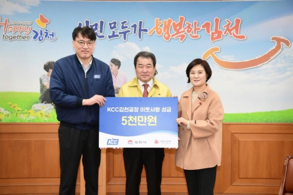 KCC김천공장(공장장 서금덕)은 지난 14일(금) 김천시청을 방문하여 이웃돕기성금 5천만원을 기탁했다. KCC김천공장 서금덕 공장장은 “우리 KCC는 기업으로서 사회적 책임을 다하기 위해 다양한 사회공헌 활동을 하고 있다. 우리 임직원들의 마음이 추운 겨울을 나는 어려운 이웃들에게 잘 전달되길 바라며 성금을 전하게 되었다. 지속적인 나눔으로 김천시민과 함께 성장하는 기업이 되도록 노력하겠다.”고 밝혔다. 김충섭 김천시장은 “코로나바이러스감염증-19로 경제여건이 어려운 이때, 매년 잊지않고 통 큰 기부를 해주신 KCC김천공장에 깊은 감사를 드린다. 오늘 전해주신 성금은 관내 저소득 이웃에게 꼭 필요한 곳에 적재적소에 쓰일 수 있도록 골고루 배분하여 유용하게 쓰도록 하겠다.”고 말했다. 기탁된 성금은 경북사회복지공동모금회를 통해 김천시 관내 저소득층 지원을 위한 다양한 사업에 쓰일 예정이다. |