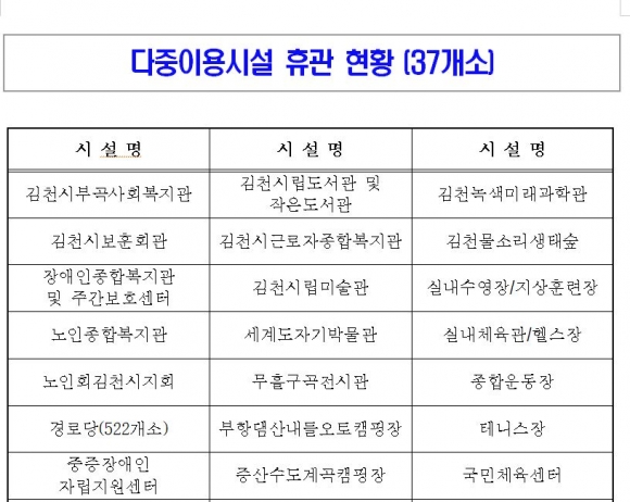 김천시(시장 김충섭)는 2월 21일 코로나-19 확진 환자 1명이 발생한 가운데 추가 확산 차단을 위한 비상대비 태세에 돌입했다. 김천시 주요 비상대책 조치는 △ 김천시 재난안전대책본부 선제적 확대 운영 △관외 출퇴근 공무원 자연휴양림 임시거주 조치 △ 공공기관 ․ 단체 집회 자제 요청 △ 다중집합 시설 점검 및 방역 △ 입국예정자 중국유학생 관리 △ 주민계도 홍보활동[재난문자 발송, 1일/1회), 읍면동 산불차량 이용 예방 가두방송] △ 다중시설 휴관(37개소) △ 선별진료소 운영(3개소) △ KTX김천(구미)역, 김천역, 예식장 등 열화상카메라 설치(5개소) 특히 △ 천주교 예배 미사와 불교 예불을 당분간 중단함에 따라 기독교에도 잠정중단하여 줄 것을 강력히 요청 △ 김천제육관에서 개최되는 하이패스도로공사 배구단의 홈경기는 원정 경기로 변경하여 줄 것을 건의 △ 황금․평화시장 5일장의 노점상도 당분간 개장하지 않도록 조치하였다. 김충섭 김천시장은 “시민의 건강과 안전을 위해서 시 차원의 대응책으로 슬기롭게 대처해 나갈 수 있도록 유관기관 ․ 단체의 적극적인 협조를 당부하고, 또한 시민들이 불안해 하지 않도록 각 상황반별 위기관리 매뉴얼을 준수하여 근무에 임해주길 바란다.”고 말했다.