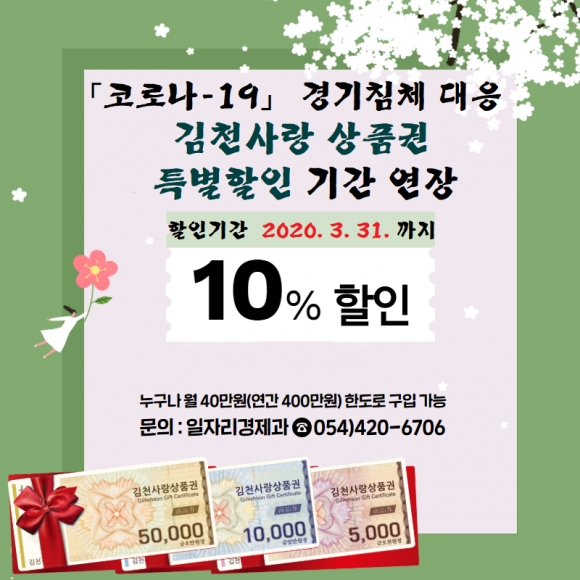 김천시는 코로나-19의 위기경보가 ‘심각’ 단계로 격상됨에 따라 침체된 지역경기 활성화의 일환으로 김천사랑 상품권 특별할인(10%) 기간을 3월 말까지 연장하여 실시하기로 했다. 또한, 최근 코로나-19 급속 확산으로 지역상권이 위축되고 서민경제에 타격이 예상됨에 따라, 김천사랑 상품권 추가 발행을 최대한 앞당겨 지역경제 회복에 적극 대응할 방침이다.