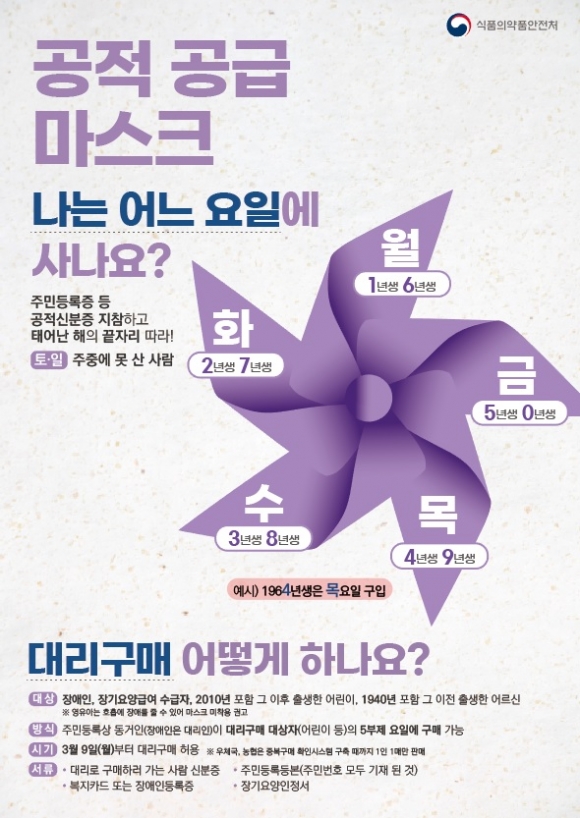 2010년 포함 그 이후 출생한 어린이, 1940년 포함 그 이전 출생한 어르신, 장애인은 대리구매가 가능하며 어린이와 어르신의 경우 대리구매자와 대리구매 대상자가 함께 병기된 주민등록등본과 대리구매자의 공인신분증을 지참하여야 하고 장애인의 경우 대리구매자가 장애인등록증을 지참하여 방문하면 된다고 한다.