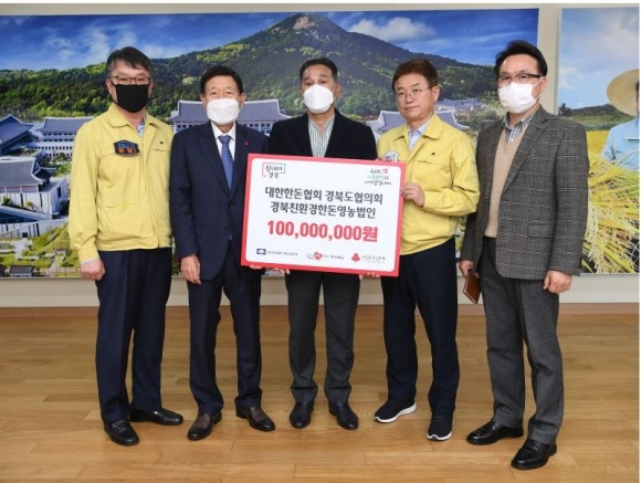 * 기부내역 : 대한한돈협회 경북도협의회 5천만 원, 경북친환경한돈영농법인 5천만 원, 낙동육우협회경북도지회 2천만 원과 1천만 원 상당 우유(17천개/200㎖) 한돈협회 경북도협의회장이자 경북친환경한돈영농법인 대표인 최재철 회장과 낙농육우협회 경북도지회 조명식 회장은 “경북 지역민으로써 이번 기부가 조금이나마 지역감염 확산방지와 취약계층에 도움이 되길 바라는 마음에 축산농가(돼지, 젖소)가 기부를 결심하게 되었다”며 “작은 정성이나마 코로나의 조속한 종결과 피해 복구에 도움이 되길 바란다”고 말했다.