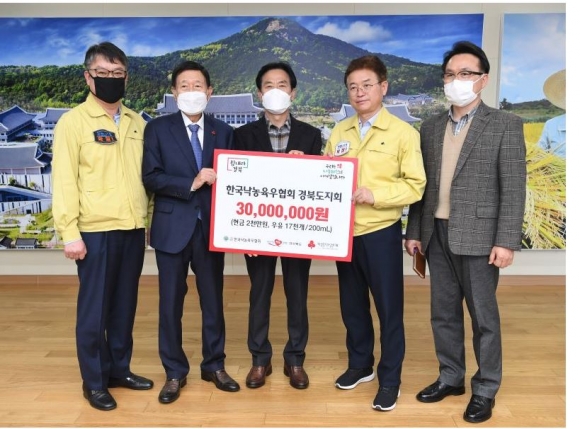 경북도는 코로나19 극복을 위한 온정의 손길이 잇따르고 있다고 밝혔다. 한돈협회 경북도협의회(회장 최재철)와 낙동육우협회 경북도지회(회장 조명식)는 9일 도청을 찾아 코로나19 확산으로 어려움을 겪고 있는 도민들을 위해 써 달라며 성금 1억 2천만 원과 1천만 원 상당의 우유를 경북사회복지공동모금회에 기탁했다.