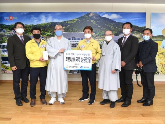 불교계의 기부도 이어졌다. 대한불교천태종 총무원 사회부장 도웅스님과 안동 해동사 주지 덕중스님은 9일 도청을 방문해 성금 1천만 원과 체온계 130개(1천3백만 원 상당)를 전달했다. 도웅스님은 “코로나19 극복을 위한 경북도 방역당국의 노력에 감사와 지지를 보낸다. 이 상황이 빨리 극복될 수 있도록 불교계에서도 열심히 기도하겠다”는 대한불교천태종 총무원장 문덕스님의 말씀을 전했다. 이철우 경북도지사는 “관심과 지원에 감사드린다. 보내주신 따뜻한 마음이 경북 곳곳에 전달되어 코로나19 극복에 힘이 되도록 하겠다”며 “경북은 숱한 위기를 극복해 온 DNA가 있다. 도민 모두가 차분히 질서를 지키고 거리두기를 실천하면서 한마음으로 단합해 바이러스와의 싸움에서 반드시 승리할 것”이라고 말했다. |