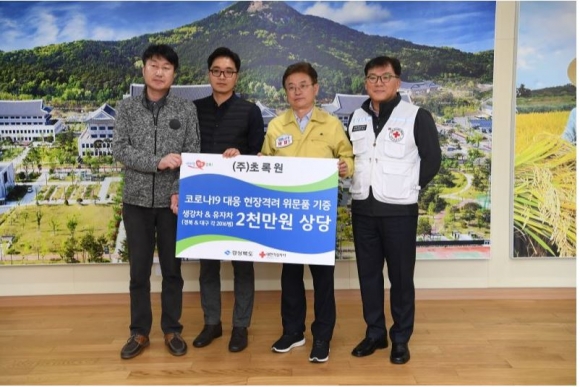 한돈협희 경북도협의회, 낙동육우협회 경북도지회 성금1억 2천만원과 우유 기탁 에이스플러스에셋 성금 5천만원, 대한불교천태종 성금 1천만원과 체온계 기부