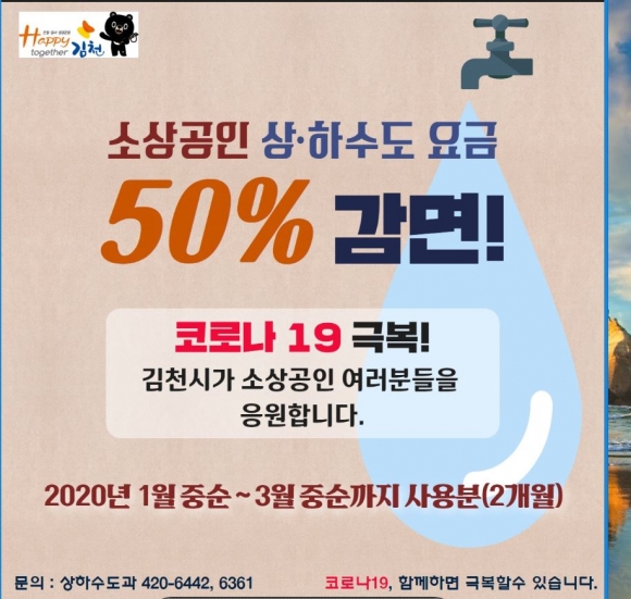 김천시(시장 김충섭)는 코로나-19 피해 소상공인에게 상∙하수도 요금을 금년 1월 중순부터 3월 중순까지 2개월간 사용분에 대하여 50% 감면 한다고 밝혔다.