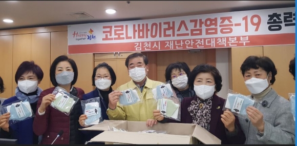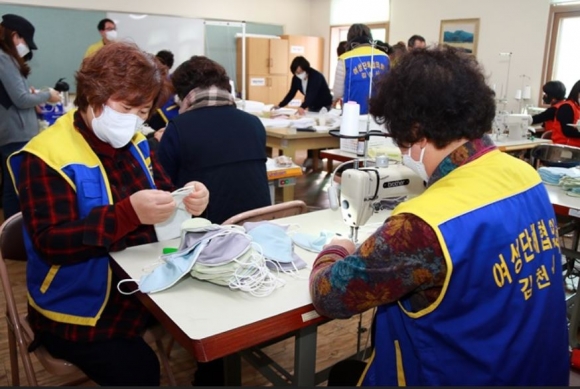 코로나 19 확산에 따른 마스크 품귀 현상으로 시민들의 불안이 더해가는 가운데 김천시여성단체협의회(회장 김삼선)와 자두꽃봉사회(회장 박경자)는 힘을 합쳐 면 마스크를 직접 제작하여 기부하기로 했다.