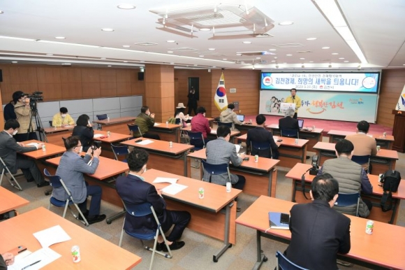 김천시(시장 김충섭)는 3월 31일 코로나 19로 인해 지역의 민생여건이 악화되고 있는 가운데 피해극복을 위한 민생안정 경제 회복대책을 발표하였다. 이번 발표는 예방적 총력대응으로 지역 내 코로나 19의 확산이 안정화 되는 가운데 지역 민생경제 회복을 최우선 대상으로 하여 긴급생활지원과 침체된 지역경제를 활성화하기 위해 그 동안 준비해온 자체 대책과 정부의 지원 대책을 아우르는 종합 대책 수립 내용을 설명하는 자리였다.