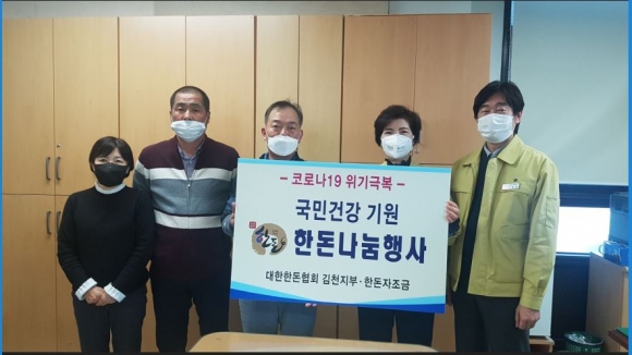 지난 27일 김천신협(이사장 박원효)은 김천시를 방문해 마스크 10,000장을 전달했다. 전달된 마스크는 기탁자의 뜻에 따라 코로나 19로 힘든 시기의 최전선에서 함께하고 있는 방역봉사자와 의료진에게 전달되었다. 뿐만 아니라, 30일에는 (사)대한한돈협회 김천지부(지부장 김이동)에서 돼지고기 846kg을 전달하여, 코호트격리로 힘든 시기를 보냈던 사회복지생활시설에 큰 힘을 보탰다.