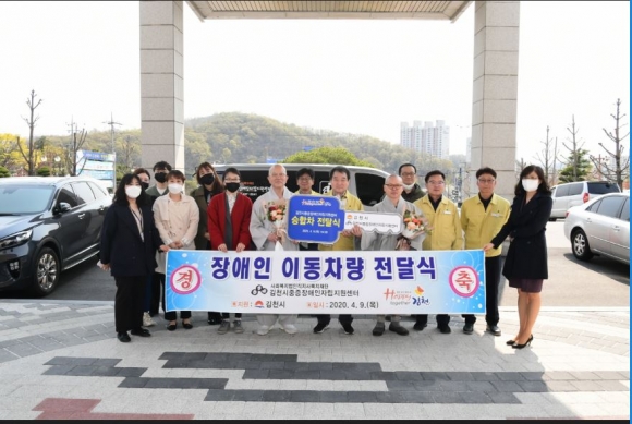 김천시는 9일(목) 시청 전정에서 김천시중증장애인자립지원센터 관계자 등이 참석한 가운데「승합차」전달식을 했다. 중증장애인자립지원센터의 승합차량은 2008년 개소 당시 김천시로부터 지원을 받아 센터를 이용하는 발달장애인들의 이동을 매일 지원하고 복지서비스의 접근성 향상을 위해 운행되어 왔으며, 노후가 매우 심각하여 이용 장애인들의 안전상의 문제로 인해 더 이상 운행을 할 수 없는 상황이었다. 이에 김천시는 센터를 이용하는 장애인들의 안전과 이동권 보장을 위해 새로운 승합차량(스타렉스)를 구입 지원하게 되었다.