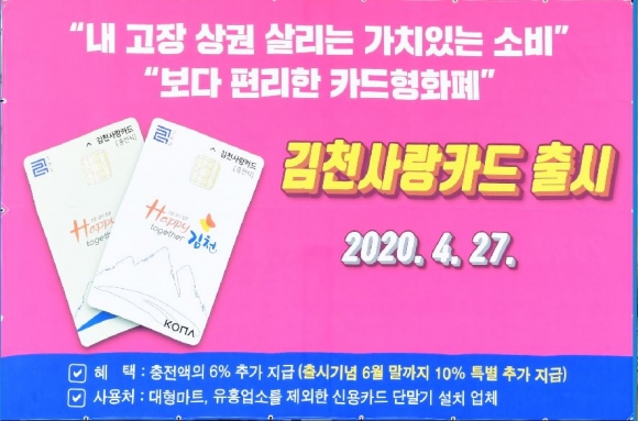 당초 7월 발행예정이던 김천사랑카드 발행을 코로나19로 급격하게 침체된 지역경제를 살리기 위해 출시일을 앞당겼다. 김천시는 출시기념으로 6월 말까지 월 40만원 한도 내에서 충전액의 10% 추가 지급(44만원) 할 예정이다.