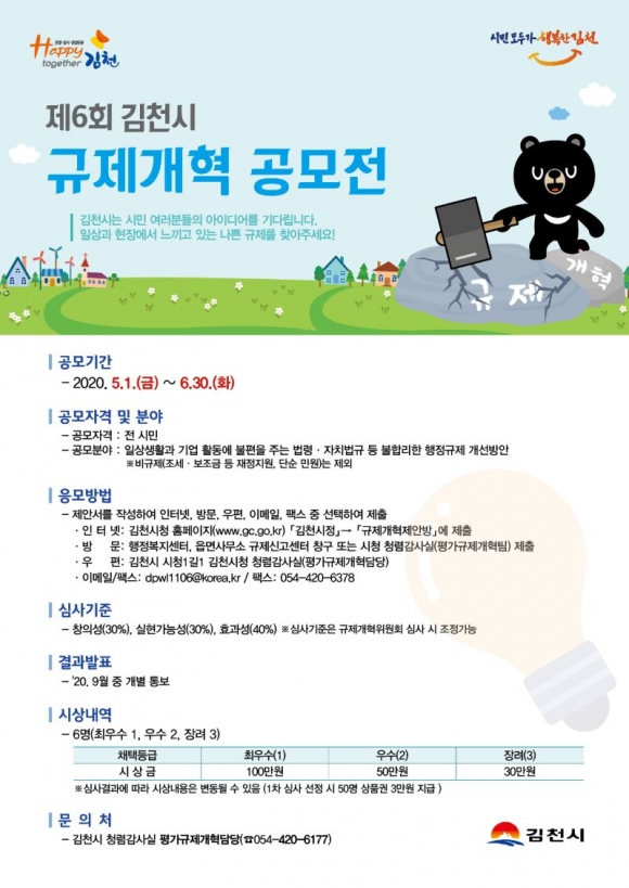 김천시(시장 김충섭)는 일상과 현장에서 느끼고 있는 불합리한 규제를 발굴․개선하기 위해 5월 1일부터 6월 30일까지 ⌜제6회 김천시 규제개혁 공모전⌟을 진행한다.