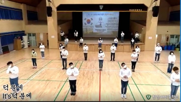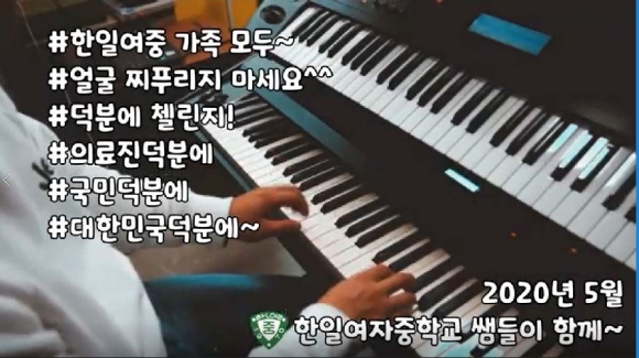 한일여자중학교(교장 이자명)는 5월 1일(수) 코로나19를 씩씩하게 잘 이겨내고 있는 학생과 학부모, 대한민국을 위한 덕분에 챌린지 영상을 제작하여 희망을 담은 응원의 메시지를 전달하였다. 이 영상은 전 교사가 함께 참여하였으며, 사회적 거리 두기를 기반으로 각 교실에서 교사들이 직접 피아노 및 기타 연주, 노래 녹음, 상황 연기, 의상 준비를 하였으며, 운동장에서의 드론 촬영 등도 포함하여 모두가 직접 제작하여 참여한 데 의미가 있다.
