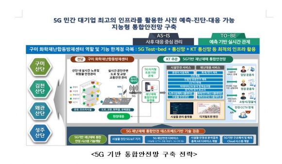 기 구축된 구미 화학재난합동방재센터의 역할 및 기능을 확대하고 5G 통신망을 가진 대기업의 주도적 참여를 통해 실시간 모니터링이 가능한 지능형 통합안전망을 구축해 기존 사후 관리 위주의 안전대책에서 예측-진단-사전 대응이 가능한 안전관리체계로 전환해 안전 혁신 산단, 재난 Zero 산단을 이룬다는 계획이다