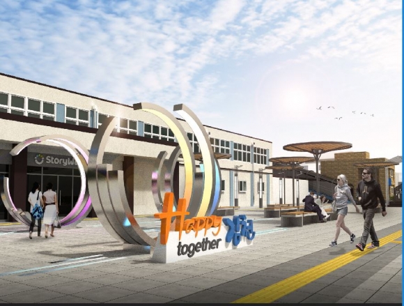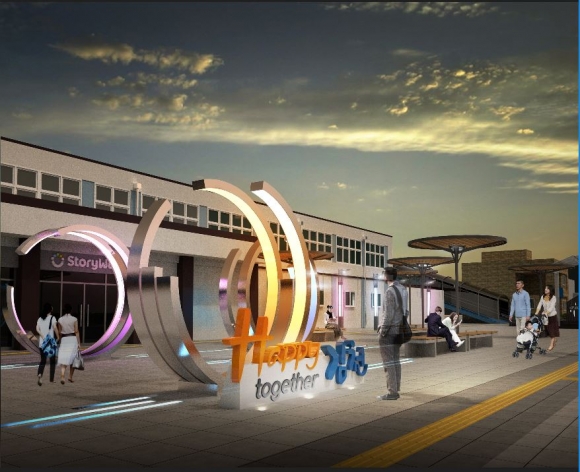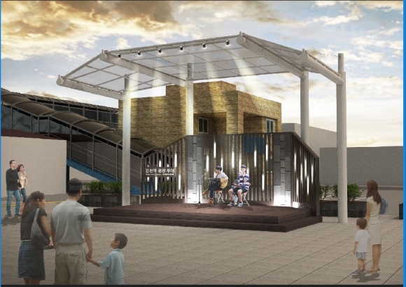 시민 축제의 장(場) - 공연장(무대) 설치 각종 축제 시에 활용할 수 있는 공연장(무대)을 설치하여 김천을 찾은 방문객이나 시민들에게 즐거움을 선사하고, 역 주변 평화로 상가나 평화시장 등 인근 재래시장의 활성화와 연계시켜 나갈 계획이다. 특히, 공연장은 우천 시나 야간에도 사용할 수 있도록 무대에 지붕을 씌우고 조명을 설치하고, 무대 뒷부분에도 세로로 조명을 설치하여 무대공연 시 축제 분위기를 고조시키는 역할을 하게 될 것이다. 다채로운 조명열주가 역 광장을 밝히다