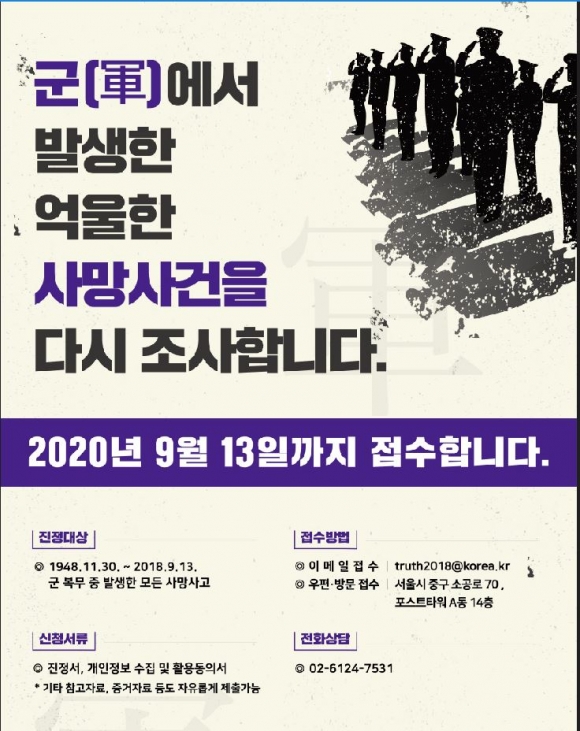 지금 바로 군사망사고진상규명위원회로 진정하세요! 2020년 9월 13일 진정 접수 마감