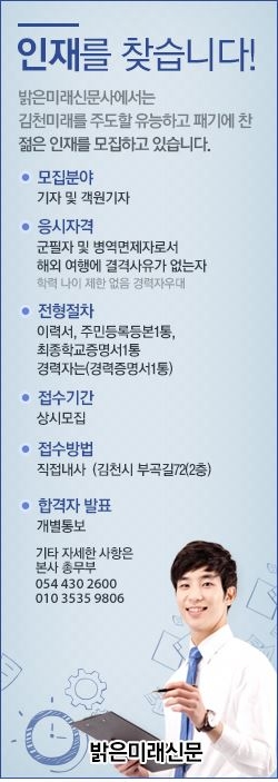 밝은미래신문사에서는 김천미래를 주도할 유능하고 패기에 찬 젊은 인재를 모집합니다. |