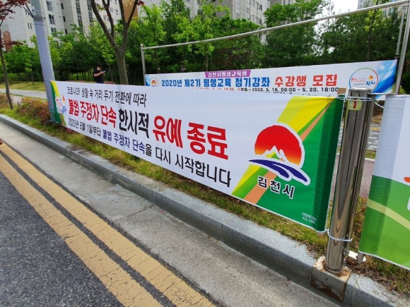 김천시는‘코로나19’발생으로 인한 소상공인의 피해를 최소화하고, 지역경제 활성화를 위해 지난 2월 17일부터 실시했던, 불법주정차 단속 한시적 유예를 종료하고, 6월 1일부터 불법 주정차 단속을 종전대로 다시 실시한다. ‘코로나19’장기화 상황에 대비하는‘생활 속 거리 두기’이행에 발맞추어, 고정형 주정차 단속 카메라가 설치 된 구간(50개소)에 대하여, 오전 7:30~11:00, 오후 16:00~18:30까지 평일과 공휴일 동일하게 단속하며, 주정차 금지구역에 10분 이상 주정차 하게 되면 단속 된다. 단, KTX 김천역 버스통행로 구간은 1분 이상 정차 하면 단속 된다. 또한 이 구역은 오전 07:30부터 오후 18:30까지 점심 유예 시간 없이 단속한다.김충섭 김천시장은 “코로나19 위기 극복에 적극적으로 동참하는 시민들의 협조에 감사드리며, 불법 주정차 관행 근절 운동으로 주차질서와 주차문화 확립을 위해 노력해 나가겠으며, 이를 위해서는 시민 모두의 적극적인 협조를 당부 드린다.”고 밝혔다.
