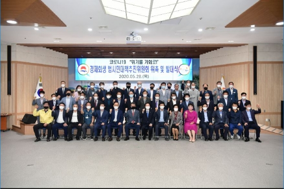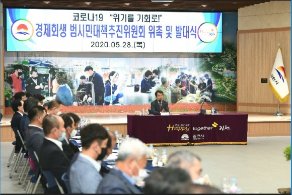 김천시는 5월 28일, 15만 김천시민의 희망과 염원을 담아“경제회생 범시민대책추진위원회”를 출범하고, 힘찬 첫발을 내딛었다. 시청 3층 강당에서 개최된 이번 발대식에서는 시의회, 기업체, 경제단체, 소상공인, 문화예술단체, 농‧축산단체, 병‧의원, 방역단체, 시민‧봉사단체, 교육‧유관기관, 교통단체, 도시재생기관, 지역언론사, 종교계, 환경단체 등 모든 분야의 전문가들이 총망라 되어 범시민적 염원을 담으려는 김천시의 고심과 노력이 고스란히 느껴진다.