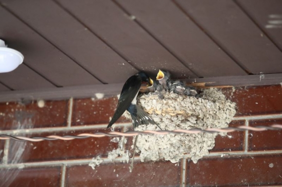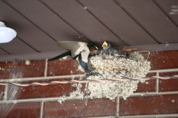 29일 영일대 북부시장 한 주택 처마 아래서 제비가 새끼에게 먹잇감을 물어다 주고 있다. 제비는 몸의 윗면은 푸른빛이 도는 검정이고 이마와 멱은 어두운 붉은 갈색, 나머지 아랫면은 크림색을 띤 흰색이며, 꼬리깃에는 흰 얼룩무늬가 있다.