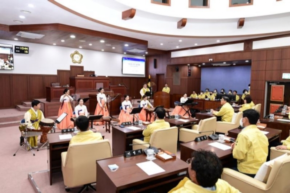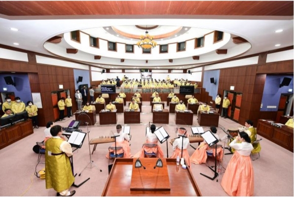 한편, 개회식에 앞서 김천시립국악단 10여명을 초청하여 시민과 함께하는 의사당 작은 음악회를 열었다. 아름답고 시원한 연주로 분위기를 사로잡으며 큰 눈길을 끌고 모두를 감동으로 매료시켰다. 또한, 김세운 의장을 비롯한 의원 전원과 집행부 공무원, 김천시립국악단 등이 코로나19 극복을 위해 노력하는 의료진과 시민들에게 감사와 응원의 마음을 전하는‘덕분에 챌린지’캠페인에 동참했다.