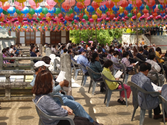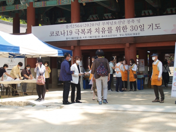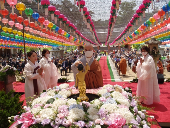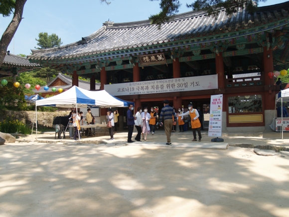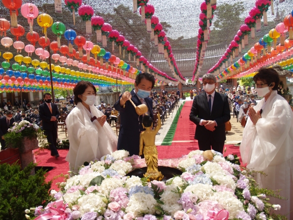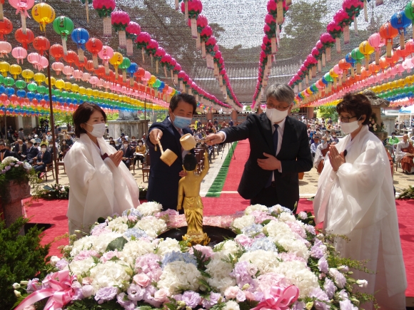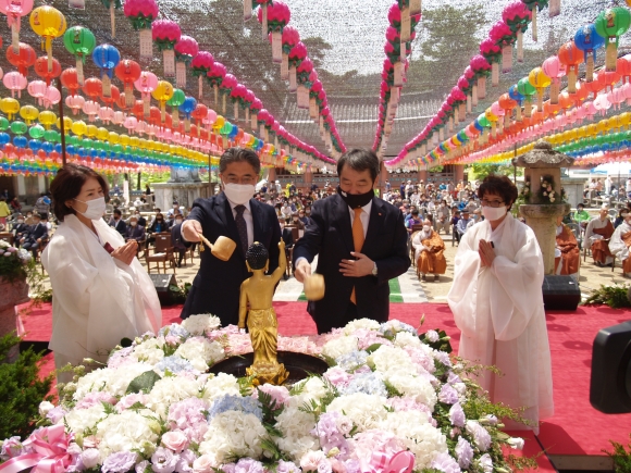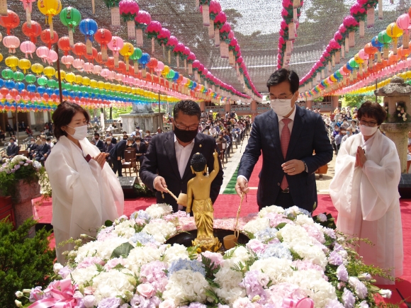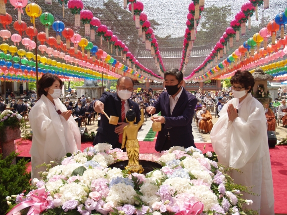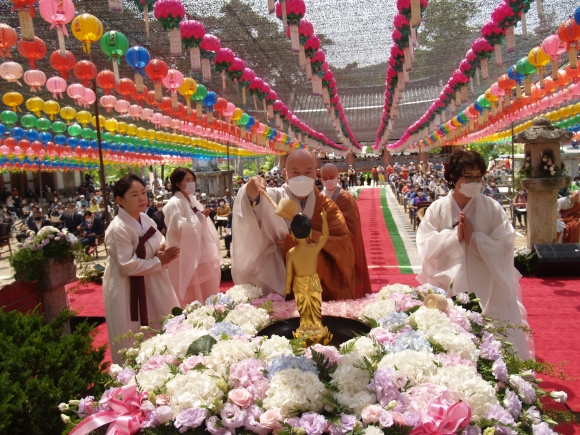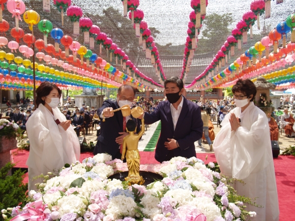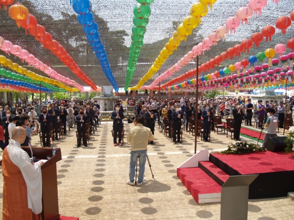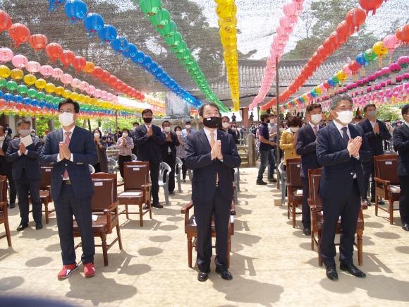 김천시는 지난달 30일 코로나 19로 한 달 미루진 부처님 오신 날 봉축 법요식이 예년보다 행사 규모가 대폭 축소된 가운데 직지사 대웅전에서 불기2564년 부처님 오신 날 보축 법요식이 거행됐다.