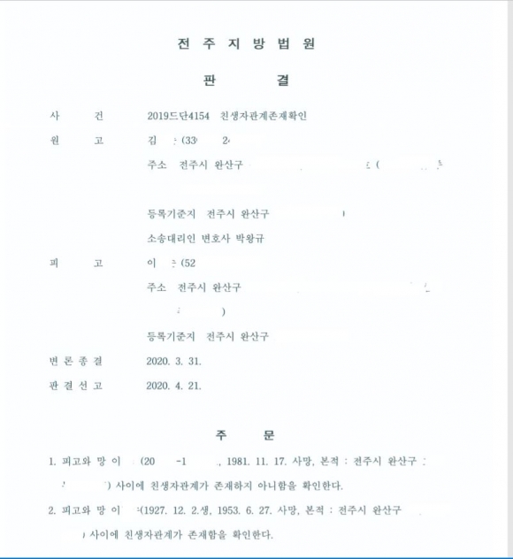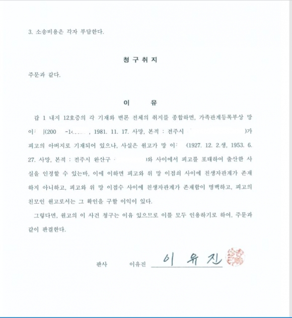 전주지법 이유진 판사는 “이씨와 해당 전사자 사이에 친생자관계가 존재함이 명백하며”며 사건청구를 모두 인용했다.