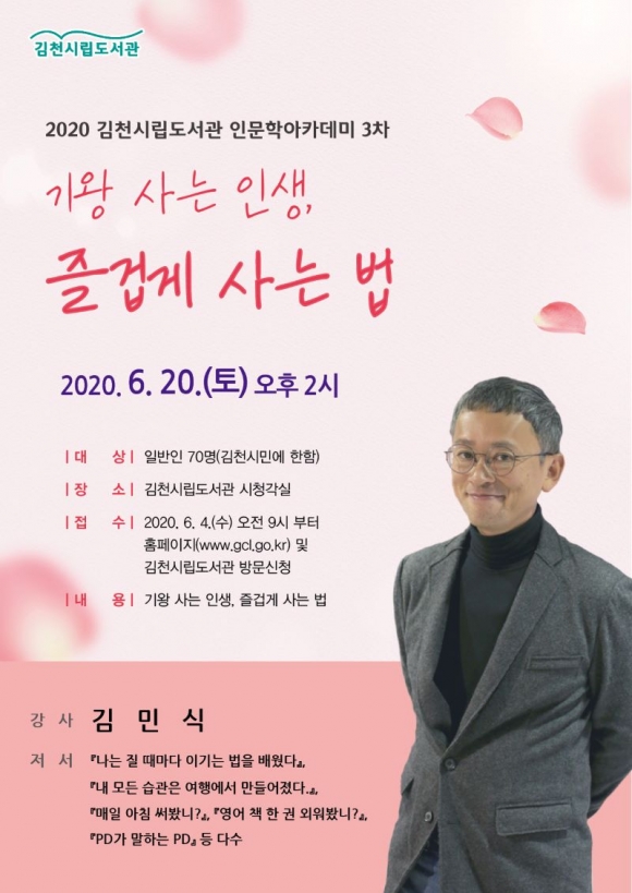한편, 오는 6월 20일(토) 오후 2시에는 제3차로 김민식 MBC PD를 초청하여 「기왕 사는 인생, 즐겁게 사는 법」주제로 강연이 열릴 계획이다.