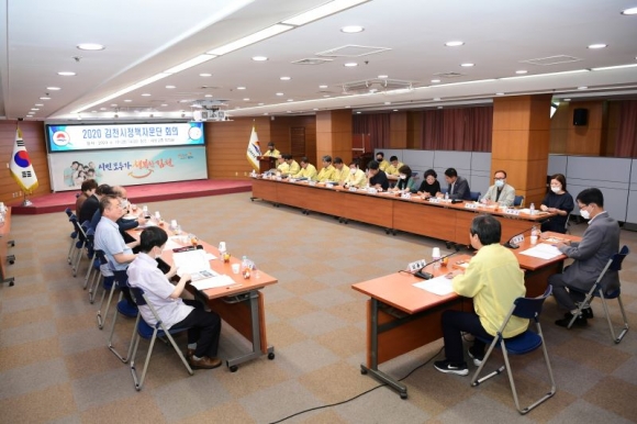 김천시(시장 김충섭) 민선7기 정책자문단(위원장 홍진영) 회의가 6월 19일(금) 14시부터 시청 2층 회의실에서 김천시장, 정책자문단 위원 및 해당 실과장‧팀장이 참석한 가운데 2020년도 상반기 정기회의를 개최했다. 코로나 19로 인해 생활 속 거리두기가 적용된 이날 회의에서 김천시는 추진 중인 주요 현안사업 4가지가 설명되었고 정책 자문단의 의견을 수렴하고 발전방안을 모색하는 자리가 되었다. 논의된 안건을 살펴보면 6월 2일 시민공청회가 개최되어 시민의 의견을 수렴한 ‘상무프로축구단 유치’건에서는 안정적인 수입 확보 및 관중 유인 방안에 대해 의견을 나눴으며, 6월 10일 주민공청회가 개최된 ‘김천시 시설관리공단 설립’건은 우수한 지방공기업이 되기 위한 준비를,