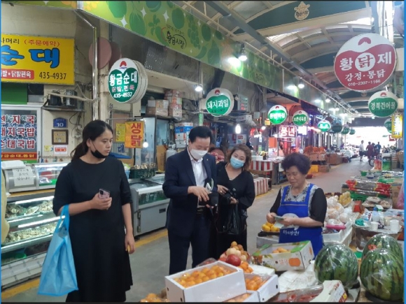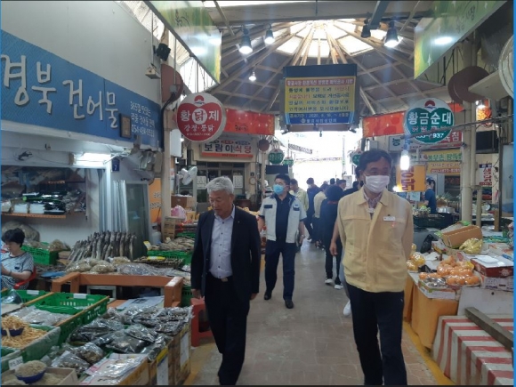 6월 23일(화) 김천경제회생 범시민대책추진위원회 경제산업분과에서는 민생현장 탐방을 통해 포스트 코로나19 김천경제 회생을 위한 다양한 시민 의견 수렴 및 공감대를 형성하고자 황금시장 일원에서「민생현장 탐방」을 추진하였다. 이번 행사는“현장에서 묻고 현장에서 답한다”는 현문현답(現問現答)의 자세로 경제산업분과 위원 16명, 김천시 일자리경제과장 등 실무지원부서장 4명 및 황금시장 임원진 등이 참석한 가운데 황금시장 상인교육관에서 1차 회의 후 전통시장(황금시장) 민생현장 탐방(장보기) 순으로 진행되었다.