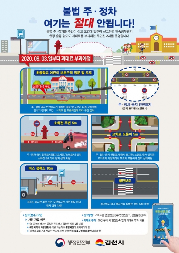 김천시는 어린이 교통안전 강화대책으로 어린이보호구역내 불법 주정차 차량에 대한 주민신고제를 운영한다이번 주민신고제는 어린이보호구역로 지정되어 있는 초등학교 정문 앞 도로 내 불법 주·정차 차량을 주민이 스마트폰 앱으로 사진을 찍어 신고하면 단속 공무원이 현장출장에 없이도 즉시 과태료가 부과되는 제도다. 시는 이번 신고제에 대한 주민홍보를 위해 7월 한달 계도기간을 운영하고 8월 3일부터 접수되는 차량부터 본격적인 과태료 부과에 들어간다.