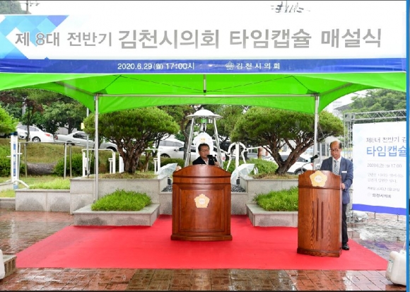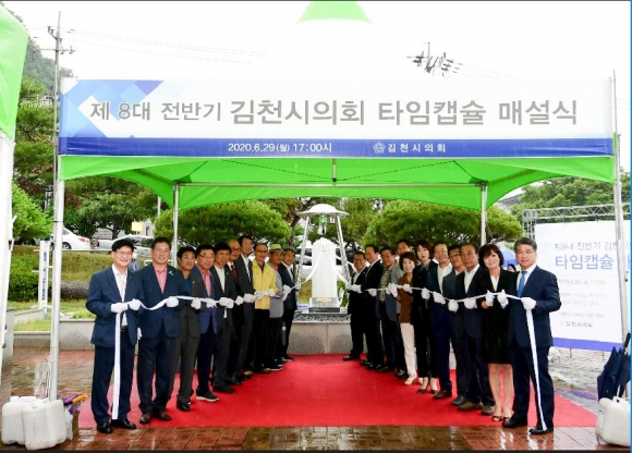 김세운 의장을 비롯한 시의원, 김충섭 김천시장 및 간부공무원, 의정회 전정식 회장 및 회원 등 60여명이 참석한 가운데, 제8대 전반기 2년간 불철주야 시민을 위해 달려온 김천시의원들의 업적 및 염원을 담아 미래의 시간으로 보내는 타임캡슐 제막식과 기념촬영 등의 순으로 진행되었다. 개봉은 20년 뒤인 2040년 6월 28일로 예정되어 있다.