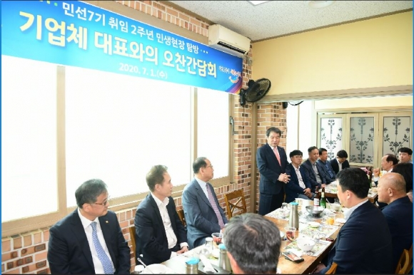 김천시(시장 김충섭)는 1일 관내 한 식당에서 기업체 대표 등 20여명과 오찬간담회를 가졌다. 이날 오찬간담회는 김충섭 시장의 성공적인 민선7기 전반기를 축하하고 상호간 새로운 출발을 다짐하고자 마련한 자리로 2019년 2월 처음 「이달의 기업」으로 선정된 ㈜현대아이티부터 2020년 7월 선정된 신농(주)까지 13개 기업체 대표가 참석한 가운데 화기애애한 분위기 속에서 1시간 가량 진행됐다.
