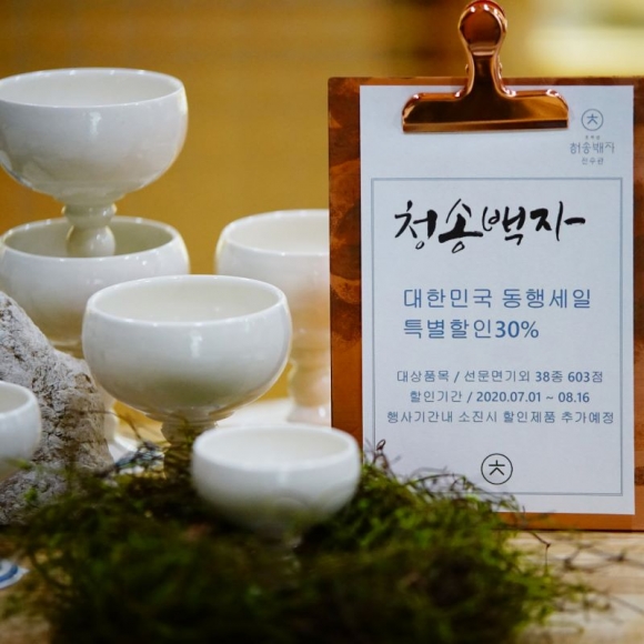 청송군의 대표적인 전통문화유산인 청송백자가 코로나19 피해극복과 내수활성화를 위해 전국적으로 진행되고 있는 대한민국 동행세일에 동참한다. 이번 특별할인판매 행사는 7월 1일 부터 8월 16일까지 주왕산관광단지에 위치한 청송백자도예촌내 청송백자판매숍에서 진행되며, 청송백자전수관 홈페이지를 통해서도 주문이 가능하다. 반상기, 차잔 등 총 603점이 대상이며 행사기간 동안 30% 할인된 가격으로 판매된다.