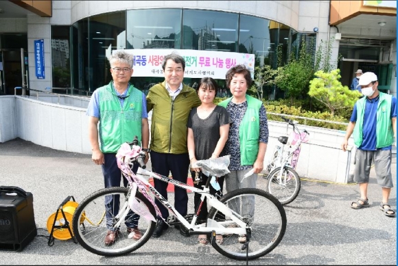 대곡동 새마을남·녀지도자협의회(회장 이도희, 손태순)에서는 7월 7일 대곡동 행정복지센터 전정에서 ‘폐자전거 리사이클링 사업’으로 재탄생한 자전거를 주민들에게 무료로 나누어 주는 행사를 개최하였다.