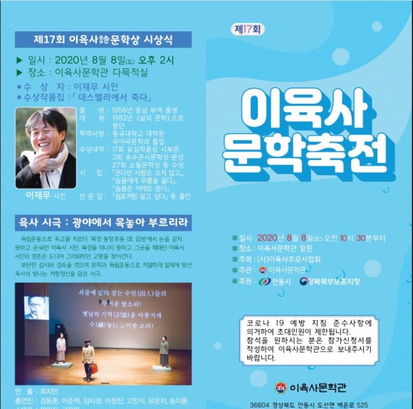 제2부에서는 ‘제17회 이육사詩문학상’ 시상식이 열린다. 수상자는 이재무 시인으로 시집 『데스밸리에서 죽다』가 선정되었다. 시상식이 끝나면 최치언 시인이 연출한 시극 ‘광야에서 목놓아 부르리라’가 다목적실에서 진행된다. (사)이육사추모사업회가 주최하고, 이육사문학관이 주관하며, 안동시와 경북북부보훈지청이 후원하는 이번 행사는 엄격한 코로나 19 예방 지침 준수사항에 의거하여 이육사문학관으로 참가를 신청한 50명으로 제한된다. 참가를 원할 경우에는 이육사문학관 사무국(☏054-852-7337)으로 연락하면 된다. |