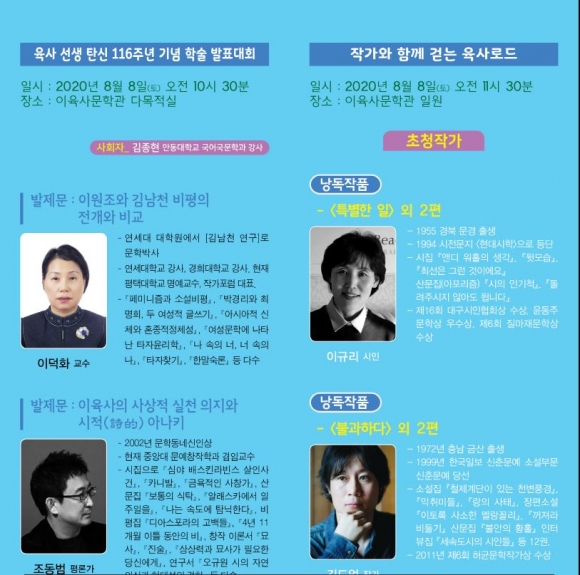 ‘제17회 이육사문학축전’이 8월 8일(토) 이육사문학관 일원에서 열린다. 이번 행사는 오전 10시 30분부터 시작하여 총 2부에 걸쳐 진행된다. 제1부 행사는 ‘육사 선생 탄신 116주년 기념 학술 발표대회’로 이덕화 교수의 「이원조와 김남천 비평의 전개와 비교」, 조동범 평론가의 「이육사의 사상적 실천 의지와 시적(詩的) 아나키」가 이육사문학관 다목적실에서 열리며, 이후에는 이규리 시인과 김도언 작가와 함께 원촌마을 일대를 걸으며 이육사의 시 정신과 문학을 느낄 수 있는 ‘작가와 함께 걷는 육사로드’가 청포도시비공원 일대에서 진행된다.