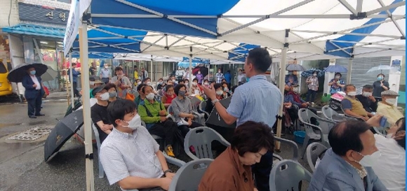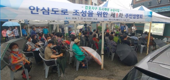 김천시(시장 : 김충섭)는 지난 22일, 중앙시장에서 2019년 선정된 감호지구 도시재생 뉴딜사업의 앵커 사업 중 하나인 ‘안심도로 조성사업’의 주민설명회를 개최하여 사업의 목적, 추진 방향을 설명하고 다양한 주민 의견을 청취하였다. 쏟아지는 빗속에서도 많은 시민들이 참석해 진행된 이 날 설명회는 김천시에서 안심도로 조성사업의 필요성과 추진방향에 대하여 설명하였고, 김천시와 협업하는 TS한국교통안전공단에서는 설계방향과 외국 및 국내의 우수사례에 대한 분석과 함께 설명회가 진행되었다.