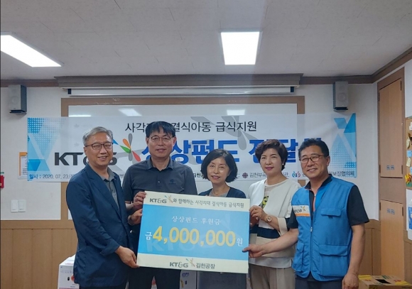 KT&G 김천공장(공장장 민웅기)는 지난 7일 김천부곡사회복지관에서 저소득 아동 20명에게 급식상자를 전달하기 위한 「결식아동 급식지원사업」후원금 400만원을 전달하였다. 「사각지대 결식아동 급식지원사업」은 KT&G 김천공장의 사회공헌사업으로 김천시지역사회보장협의체(위원장 김충섭, 공동위원장 배수향)의 복지자원 연계를 통해 2017년부터 시작하였으며, 방학 기간 중 저소득층 결식아동에게 급식을 지원하기 위해 추진되고 있다.
