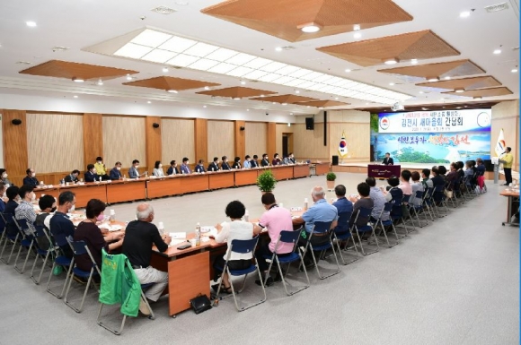 지난 7월 28일(화) 오후 4시, 시청 3층 강당에서 임영식 새마을회장을 비롯하여 새마을회 각 단체장, 읍면동 새마을지도자협의회장 및 부녀회장 등 총 60여명이 참석한 가운데 포스트 코로나 대비를 위한 간담회를 개최하였다. 이날 간담회에서 김충섭 김천시장은 지난 2월 말부터 지역 내 코로나-19 확산 방지를 위해 매주 월·수요일에 진행된 “일제 방역의 날”에 동참하고, 지역 내 일손돕기 등 지역사회를 위해 힘써주신 새마을회의 노고에 감사의 인사를 전했다. 또한, 간담회에서는 시에서 역점 시책으로 추진하고 있는 현안 사업들에 대한 상세한 설명과 함께 여전히 안심할 수 없는 코로나-19의 지역 내 확산 방지를 위해 생활 방역, 생활 속 거리두기, 지역 경제 살리기 등 당부사항을 전달하였으며, 새마을회원들과 함께 지역 현안에 대해 소통하고 공유하는 시간도 가졌다.
