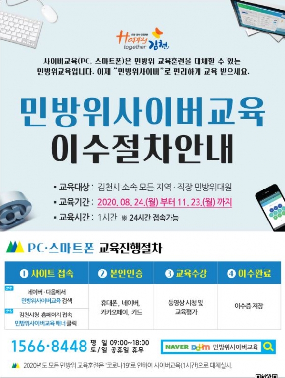 김천시(시장 김충섭)는 코로나19 감염 확산 방지를 위해 기존 5년차 이상에만 한정해서 실시하던 사이버 교육을 2020년도에는 1~4년차 대원까지 포함한 전 민방위 대원을 대상으로 하여 확대 실시한다고 밝혔다. 즉, 1~4년차 민방위대원의 집합교육(4시간) 및 5년차 이상 민방위대원의 사이버교육 또는 비상소집훈련을 전부 사이버교육(1시간)으로 대체하기로 한 것이다. 이번 사이버교육은 오는 8월 24일부터 11월 23일까지 3개월간 실시되며, 김천시 소속 대원이면 PC 또는 스마트폰을 이용해 시간과 장소에 구애받지 않고 교육 이수가 가능하다. 교육방법은 김천시청 홈페이지 배너나 포털 사이트에서 민방위 사이버 교육센터를 접속하여 본인 인증 후에 교육을 수강할 수 있으며, 교육과목의 구성은 민방위 제도, 민방위대 임무·역할, 인명구조, 응급처치 등으로 총 20문항 중 14문제 이상(70점 이상 획득 시)을 맞추어야 교육을 이수한 것으로 인정이 된다. 특히, 올해는 코로나19 여파로 혈액 수급에 어려움을 겪고 있는 상황을 고려하여, 헌혈에 참여한 대원이 헌혈증을 제출하면 민방위 교육 1시간을 받은 것으로 인정한다. 시 관계자는 “다중집합으로 인한 코로나19 감염 위험을 사전에 차단하고자 전 민방위대원을 대상으로 사이버교육을 진행하게 됐으며, 민방위 대원들의 적극적인 참여 등 이번 교육을 통해 대원들의 재난 대응능력이 향상되길 바란다.”고 말했다. |