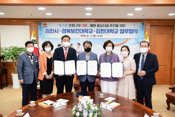 김천시(시장 김충섭)은 8월 11일(화) 학생 참여형 「포스트 코로나19 대응」예방홍보 사업의 성공적인 추진을 위해 경북보건대학교·김천대학교와 업무협약을 체결하였다. 이날 협약식에는 김충섭 김천시장, 이은직 경북보건대학교 총장, 윤옥현 김천대학교 총장과 각 대학교 임원진이 참석하였다. 이번 협약은 경북보건대학교 및 김천대학교 학생으로 예방 홍보단을 구성하여, 김천역 및 김천구미역 등 다중이용시설에서 생활 속 거리두기, 올바른 마스크 착용 및 개인위생수칙 준수 등의 코로나19 핵심 예방수칙을 홍보하는 것을 요점으로 한다.
