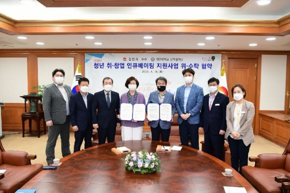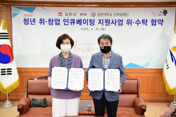 김천시(시장 김충섭)는 8월 11일 김천대학교 산학협력단(단장 백열선)과 2020년 청년 취·창업 인큐베이팅 지원사업 위·수탁 협약을 체결하였다. 시장 접견실에서 열린 본 협약식에는 김충섭 시장, 김재광 부시장, 윤옥현 김천대학교 총장, 백열선 김천대학교 산학협력단장, 위성빈 산학협력중점 교수 등이 참석하였다. 청년 취·창업 인큐베이팅 지원사업은 사회적경제기업을 발굴·육성하고, 청년에게는 취·창업 워밍업 기회를 제공하기 위해 올해 김천시에서 추진하는 신규사업으로 일자리 복지실현을 위한 사회적경제활성화와 청년일자리 창출 모두를 실현하는데 목적이 있다, 김천시는 효율적인 사업운영을 위해 김천시 청년센터(황산로 67)에 별도의 인큐베이팅 공간(77㎡)을 마련하였다.