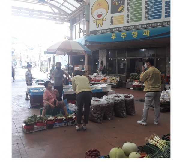 김천시(시장 김충섭)와 평화·황금시장 상인회에서는 장날을 맞아 타 지역 노점상과 인근 주민의 유입에 따른 코로나19 재발생을 예방하고자 사전 계도 활동을 적극 실시했다. 이번 30일(일) 장날 코로나19 대응은 최근 코로나19 재확산에 따라 하루 평균 200~300명 이상의 확진자가 속출하는 가운데, 서민 생계의 최일선인 전통시장 상인과 시민들의 안전을 위한 대응 차원에서 실시되었다.김천시 일자리경제과 직원과 평화·황금시장 상인회 임원진들은 일요일 이른 아침부터 시장 입구 및 골목 구석구석을 돌며 상인들에게 마스크 2,000여장을 직접 배부하였다. 또한 마스크 착용 실태 및 생활 속 거리두기 준수 여부 등을 점검하였으며, 개인 위생관리 또한 철저를 기해달라고 당부했다. 김한규 평화시장 상인회장과 최진영 황금시장 상인회장은 “일요일 아침임에도 장날을 맞아 매번 김천시에서 관심을 가져주고, 마스크 및 방역약품 지원 등 예방활동을 펼쳐주신 것에 대해 감사드리며, 우리 상인들도「Happy together 김천 운동」의 핵심 가치 중 하나인 ‘청결’을 생활화해 코로나19라는 전국가적 위기 극복에 적극 동참하겠다”고 말했다. 또한 김천 평화시장과 황금시장 상인회에서는 코로나19 예방 및 쾌적한 시장 환경 조성을 위해 주 1회 이상(장날 전후) 주기적인 자체 방역 활동을 실시 중에 있다 |