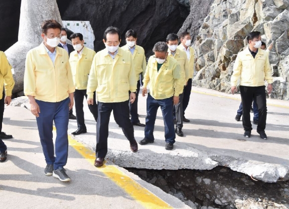 정세균 국무총리는 9일 이철우 경북도지사, 문성혁 해양수산부 장관, 안영규 행정안전부 재난관리실장 등과 함께 태풍 ‘마이삭’ 및 ‘하이선’으로 피해가 집중된 울릉군 현장을 방문했다.