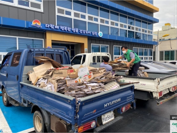 김천시 봉산면새마을협의회(회장 박희왕, 부녀회장 이남수)에서는 9일 「Happy together 김천」 청결운동을 실천하기 위해 마을별 수집한 고철, 폐지, 헌옷 등 재활용품 수집활동을 펼쳤다.
