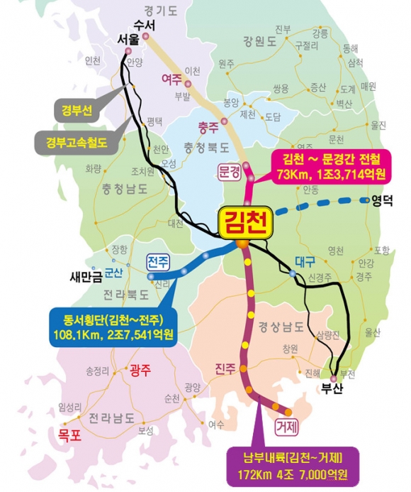 김천∼거제 남부내륙철도 2022년 착공추진 1966년도에 김삼선(김천∼삼천포)이란 이름으로 철도건설 기공식은 했지만 여러 가지 사정으로 추진되지 못했던 사업이 반세기를 넘겨 김천∼거제간 남부내륙철도 건설사업으로 확정되어 추진되고 있다. 총 연장 172㎞, 4조7천역원의 사업비로 2022년 착공하여 2026년 완공을 목표로 추진되고 있으며, 현재 기본계획을 수립 중에 있다. 이와 함께 김천∼문경간 철도사업도 기획재정부 예비타당성조사 대상사업으로 확정되었고, 김천∼전주간 철도사업과 대구광역권 전철망 연장, 철도관련 산업유치도 추진하고 있다. 시청∼혁신도시 연결 도로개설 아울러 광역교통망과 연계해서 국도 3호선 및 국도 59호선 확장사업, 시청∼혁신도시·교동택지∼산업단지·옥률∼대룡 간 도로개설로 시가지 간선도로망을 새롭게 구축하고 지역간 균형발전을 도모하고 있다. 대구경북 통합신공항 연결 교통망 확충 또한 대구경북 통합신공항의 입지가 확정됨에 따라 김천∼통합신공항간 철도건설과 북구미IC∼해평∼군위간 고속도로 연결로 교통 접근성이 더욱 편리해진 김천은 광역교통의 중심지로 그 장점이 더욱 강화되고 있다. ◧소득이 늘어나고 살기좋은 농업·농촌
