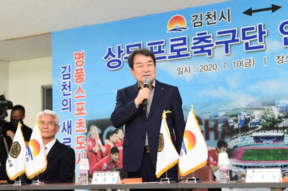상무프로축구단이 올해로 상주시와 연고지 계약이 종료됨에 따라 김천시가 유치를 추진하고 있다. 김천시는 상무프로축구단 유치에 앞서 전문학술 용역기관에 유치 타당성 검토를 실시하고, 지난 6월 2일에는 시민공청회를 거쳐 다양한 의견도 수렴했다. 용역결과 상무프로축구단 유치로 1,460억원의 경제파급효과와 2,700여명의 고용창출이 기대되는 것으로 나타났다. 상무축구단 경제효과 1천5백억원, 고용창출 2천7백명 시는 유치타당성 용역결과를 비롯한 찬성과 반대에 대한 의견을 적극 수렴하는 한편, 시민들이 우려하고 있는 부분에 대해 심도 있게 검토하고 반영해서 시민들의 적극적인 환영을 받는 가운데 상무프로축구단이 유치되기를 바라고 있다. 지난 7월 10일 김천시와 국군체육부대는 연고지 협약식을 갖고 새로운 출발을 알렸다. 이 날 협약식은 “2021년부터 상무프로축구단이 김천을 연고지로 하여 김천시의 문화체육 발전과 체육진흥을 위해 다함께 노력하겠다.”는 내용을 담은 협약서에 공동서명 했다. 협약 체결로 상무프로축구단은 상주와 맺은 10년간의 인연을 마감하고 2021년부터 김천시 마크를 달고 K리그에 참가하게 된다. 2021년 김천상무프로축구단 출범, 지난 7월 체결한 연고지 협약식에 이어 9월 10일에는 상무프로축구단 사단법인 설립을 위한 발기인대회 및 창립총회를 가졌고, 향후 한국프로축구연맹 클럽 가입절차를 거쳐서 내년도 초에 김천상무프로축구단을 정식 출범할 계획이다. 김천시는 지방 중소도시에서는 최초로 2개의 프로구단을 운영하는 이례적인 지방자치단체가 되는 만큼 스포츠 특화도시로서 김천시민들이 가지는 자부심을 한층 더 높이고, 지역축구 발전과 지역경제 활성화에 크게 기여할 것으로 기대하고 있다. ◧해피투게더 김천운동 시민동참