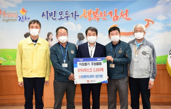 코오롱인더스트리(주) 김천1공장(공장장 김용섭)은 28일 김천시에 KF94 마스크 2,000매를 기탁했다. 이 날 마스크 기탁을 위해 김천시청을 찾은 김용섭 김천1공장장, 송성근 공제회장, 협력업체 신승호 대표는 민족고유의 명절 추석을 맞아 장애인복지관 및 취약계층 지원에 사용해달라며 마스크를 전달했다. 코오롱인더스트리(주)김천공장은 지난 3월에 임직원의 자발적 참여로 모아진 38,800천원의 온누리상품권을 코로나19 극복을 위한 취약계층 지원에 사용해달라며 기탁한 바 있다. 김충섭 김천시장은 “취약계층 지원을 위해 특별히 마스크를 지원해 주신 코오롱인더스트리 김천1공장 임직원분께 깊은 감사를 드리며 취약계층 지원에 뜻있게 사용하겠다.”며 고마운 마음을 전했다. |